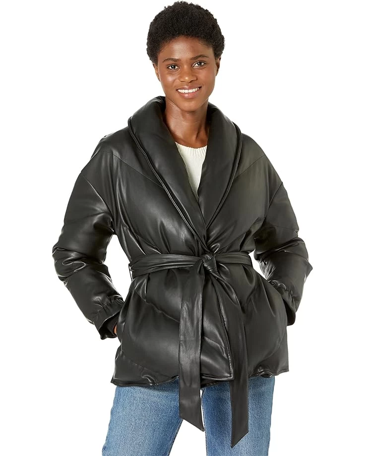 Stay in trend wearing this Blank NYCâ„¢ Black Faux Leather Puffer Jacket with Belt Closure.SKU: #9616524Collar design neckline.Button and tie closure.On-seam, slash pocket at the front sides.Puffer jacket with ruffled cuffs.97% polyester, 3% elasatane.Hand wash.Imported.Product measurements were taken using size SM. Please note that measurements may vary by size.Measurements:
