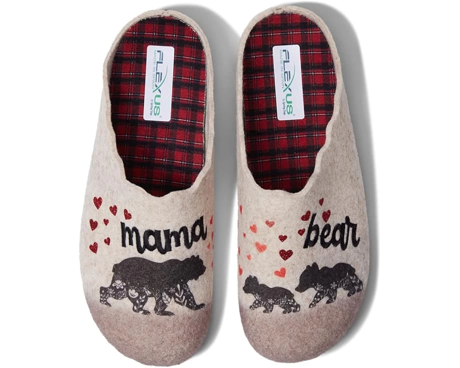 Please note that the brand is currently transitioning from Fly Flot® to FlexUsâ„¢ by Spring Step®. Although the footbed may be marked with either brand name, please know that you are still receiving the same great shoe.SKU: #9795385Relax at home wearing the super comfy and stylish Flexus® Mamabear Slippers.Textile upper, lining, and insole. Removable insole.Slip-on style. Round toe. Open back. Eye-catching bear and hearts printed on the upper.Scalloped edge for added style. Synthetic outsole with added traction and durability. Made in Spain. Product measurements were taken using size EU 40 (US Women’s 9), width M. Please note that measurements may vary by size.Measurements: