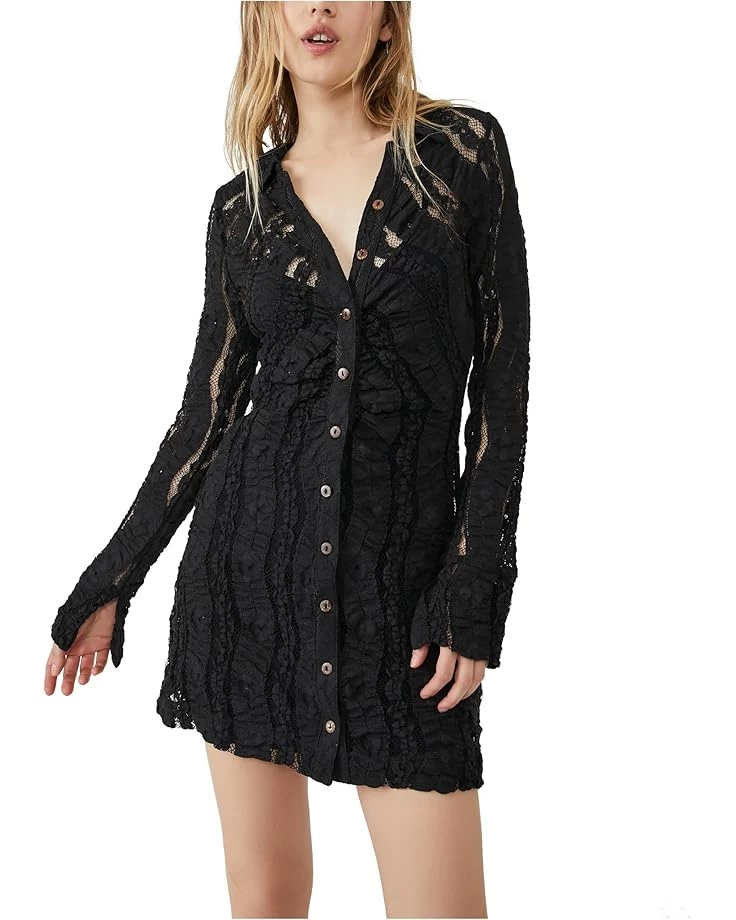Style up in the romantic Free People™ Shayla Lace Mini dress for a fun and sexy look.SKU: #9842159Staple, long sleeve silhouette. Mini-length dress. Classic collar design and long bell sleeves.Button-front closure. Sheer design for added dimension.Straight hemline.Main: 64% cotton, 35% polyamide, 1% elastane;