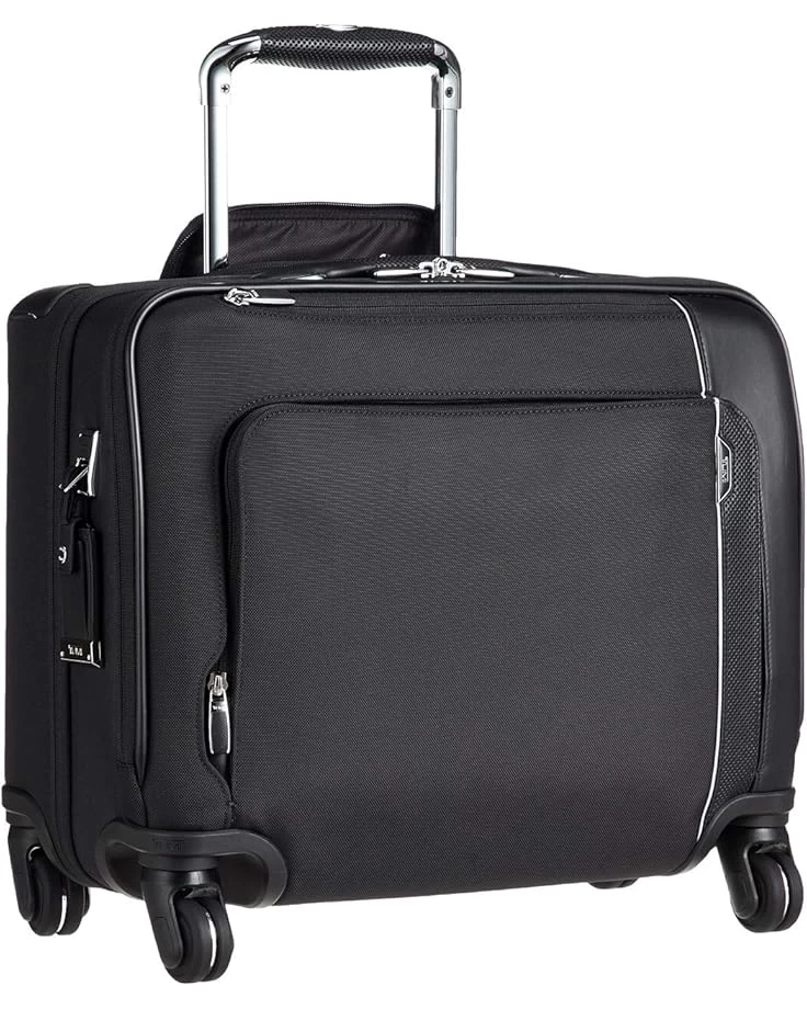 Carry-On size and weight allowances vary by airlines.SKU: #9273331Part of the Arrivé Collection.Business will be pleasure with the handsome Tumi® Arrivé Compact 4 Wheeled Brief.Crafted in durable ballistic nylon with leather trims, and elevated by high-polish chrome details, elegant curves, and sleek magnetic zippers. Retractable leather top carry handle.Five-stage telescoping handle.Double-zip entry to main compartment.Front U-zip pocket with magnetic zipper pull.Front straight-zip pocket with magnetic zipper pull.Zip opening to USB port/power bank pocket (power bank not included).Magnetic luggage tag.Interior features a padded laptop pocket (fits 15″ screens), two padded tablet pockets, two zip pockets (one with USB cable designed to fit your power bank), four open pockets (one with protective lining), compression straps, card pocket, pen loops, and a removable leather key ring.This piece features Tumi Tracer®: an exclusive program that helps you reunite with your lost or stolen items.Add-a-Bag sleeve.Bumper guards and skid bar.Four dual-spinner wheels.Imported.Measurements: