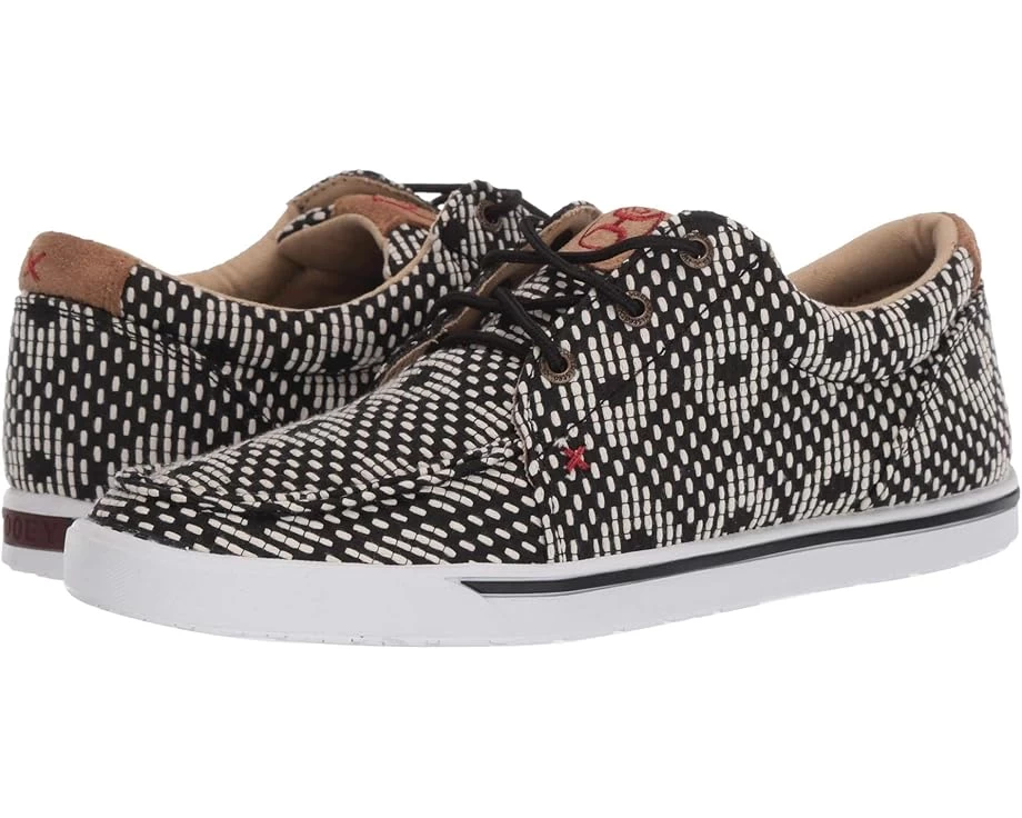 The Twisted X® WHYC017 Hooey Twisted X Black & White Graphic Loper sneakers update this classic silhouette with a graphic black-and-white print.SKU: #9431261Low-top canvas sneakers feature a moc-toe silhouette with unique Hooey print style.